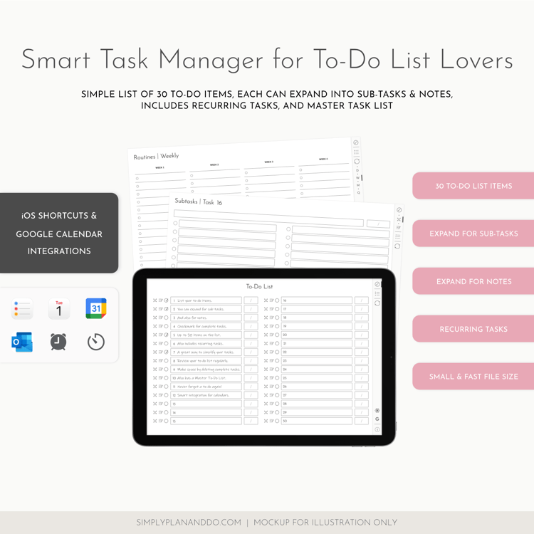 Keep on top of your tasks with this simple list of 30 to-do items. Each item can expand into a list of sub-tasks and notes.