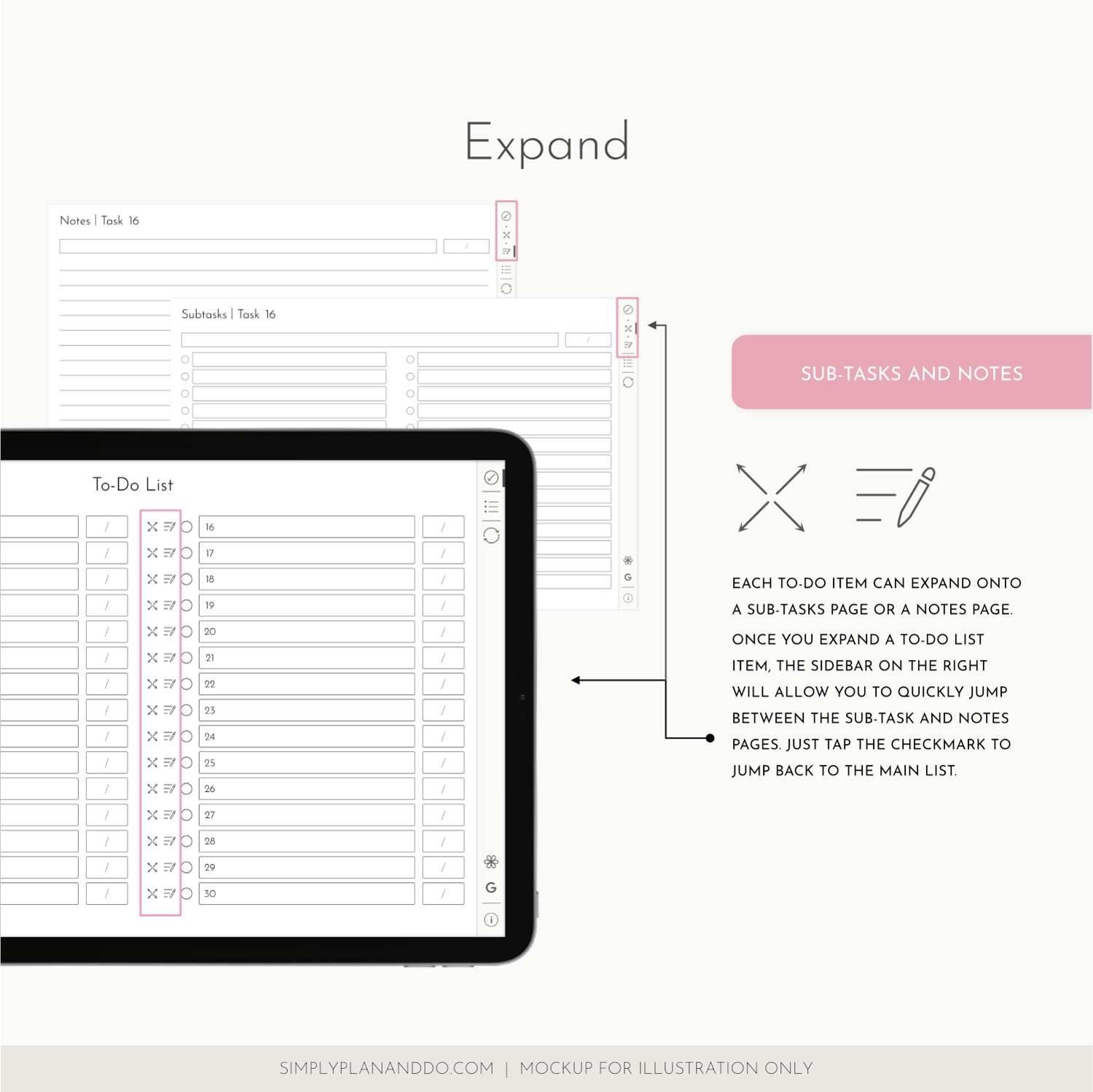 Each task can be expanded to a sub-task page and a notes page.